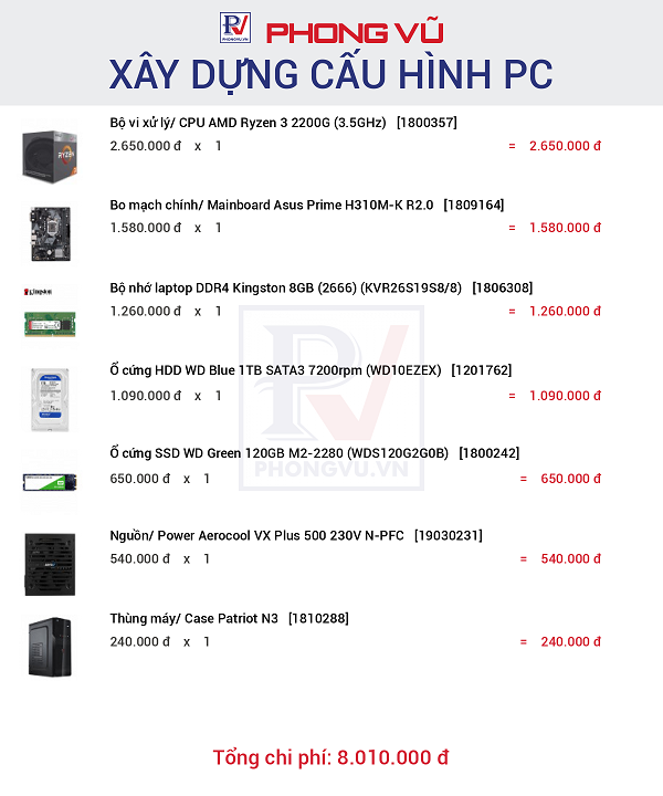 Chịu khó tìm mua chỗ khác sẽ có giá tốt hơn, nếu không cần lưu trữ thì khỏi HDD, làm cái SSD 500GB luôn giờ cũng tầm hơn triệu là có rồi. Nếu có điều kiện nâng cấp trong tương lai không quá xa thì 1 cây 8GB để dễ nâng, còn lâu mới nâng cấp thì nên mua 2 cây 4GB để phát huy khả năng con 2200G nhé. Nhu cầu đồ họa 2D vậy là ổn, không cần card rời đâu.
