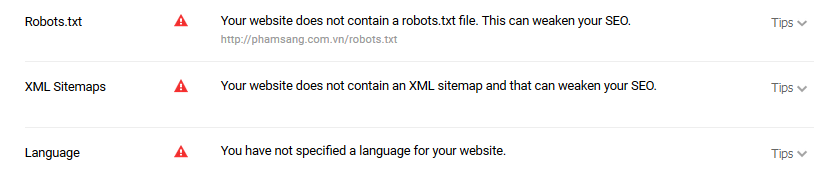 • Thứ 2 mình vào web bạn file phamsang.com.vn/robots.txt không có, bạn nên tạo file robots.txt để điều hướng google tới đúng tập tin sitemap.xml của web.