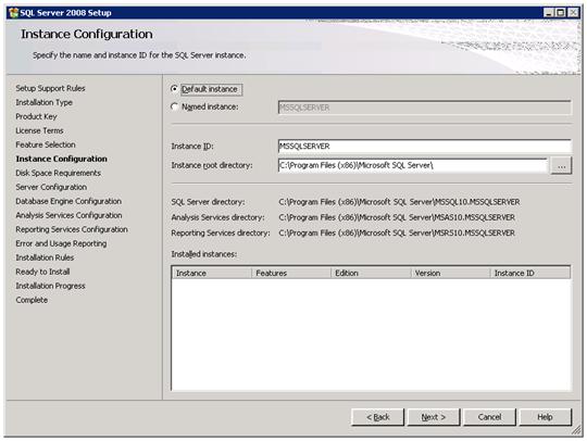 Cài đặt Instance mới hoặc để Default (nếu bạn đã cài SQL Server 2000 hoặc 2005 trước rồi thì phải đặt Instance name khác)