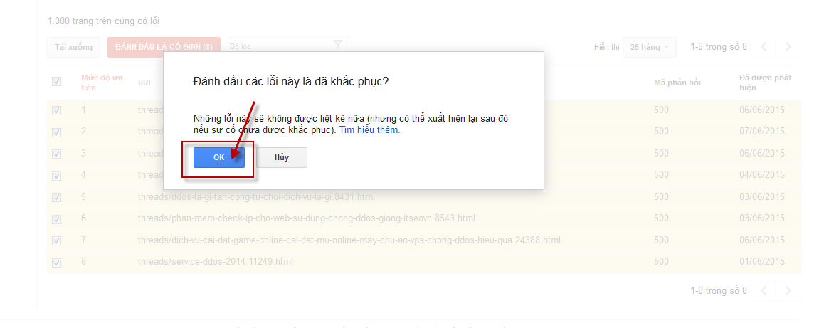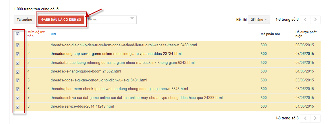 • Checked chọn những trang cần báo cho google biết và chọn "Đánh dấu là cố đinh" -> OK